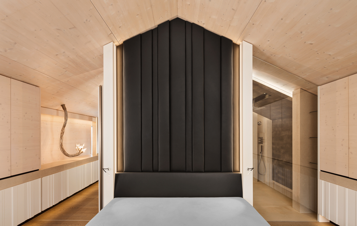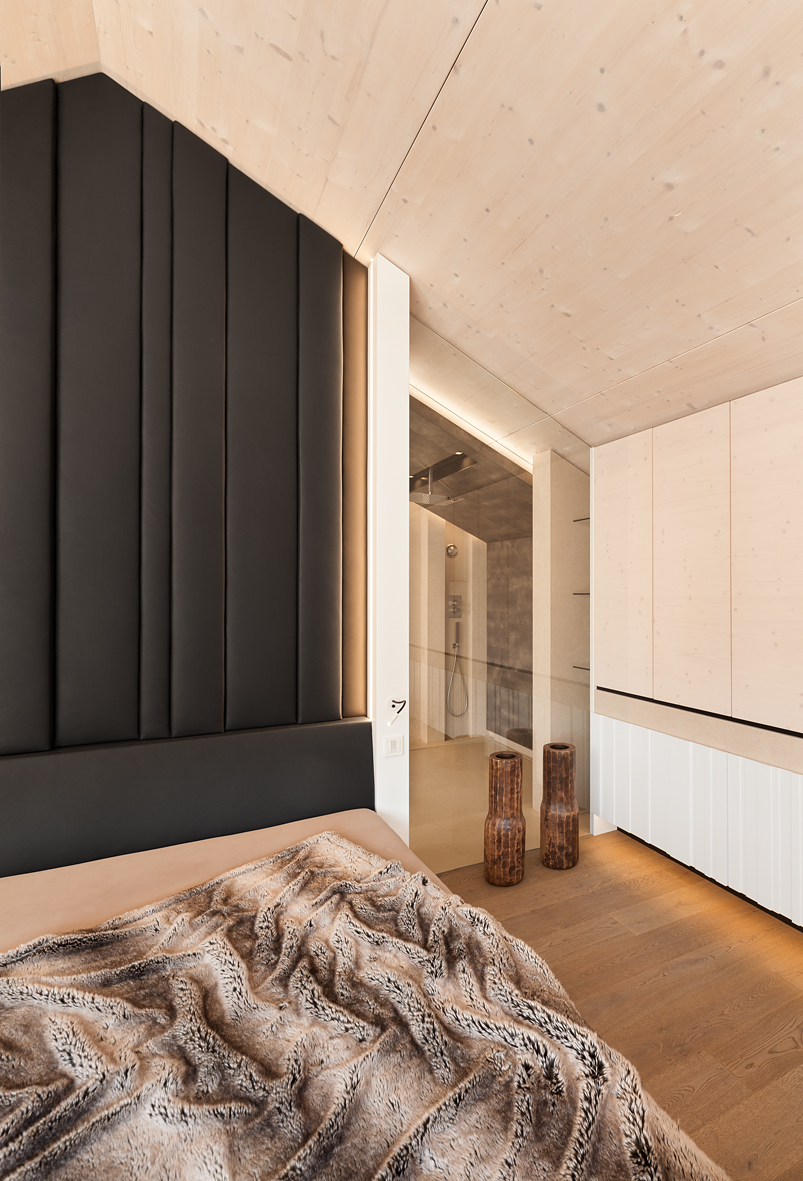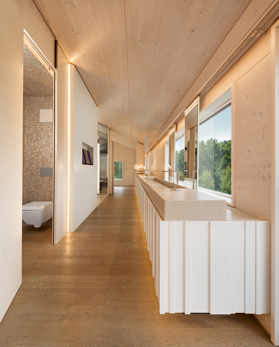 Der pure Luxus, hochwertige Details zeichnen dieses Projekt aus. Das Obergeschoß zeigt was in einem Massivholzhaus an Ästhetik steckt. Die natürlich elegante Oberfläche des Massivholzes verknüpft mit eleganten Planungsdetails und hochwertigster Handwerkskunst zeigt, wie ein Holzhaus modern interpretiert werden kann.